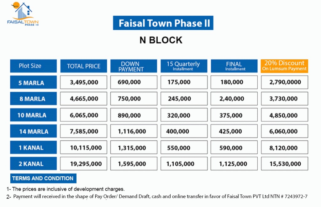 Faisal Town Phase 2 is a well-designed community that delivers a complete lifestyle with a perfect blend of residential, commercial, and recreational spaces. It offers a variety of plot sizes—5 Marla, 8 Marla, 10 Marla, 1 Kanal, and 2 Kanal—alongside dedicated commercial zones for business activities. The project includes lush parks, jogging tracks, play areas, and landscaped spaces that promote a healthy lifestyle. Essential facilities such as schools, colleges, hospitals, and mosques are thoughtfully integrated. With a wide main boulevard, efficient road network, underground utilities, modern sewerage, sports complexes, community centers, and round-the-clock security, Faisal Town Phase 2 ensures a vibrant, secure, and convenient living environment.